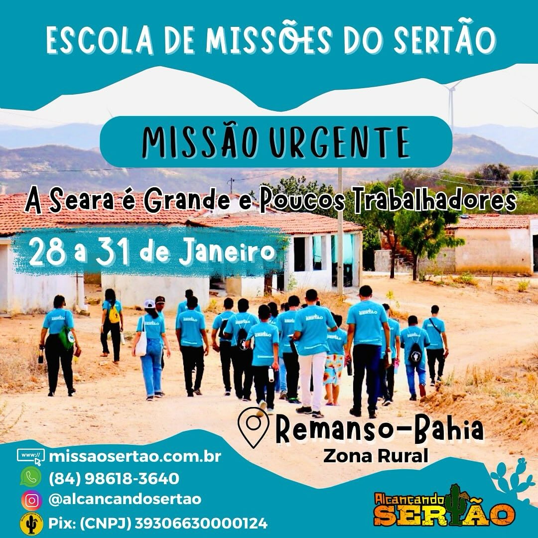 A Escola de Missões do Sertão não é apenas um curso, mas uma resposta viva ao clamor de um povo e ao desejo do coração de Deus. É tempo de unir forças, fortalecer o trabalho da Igreja Batista em Remanso e contribuir com amor e dedicação para o avanço do Reino de Deus na zona rural do Sertão Nordestino.